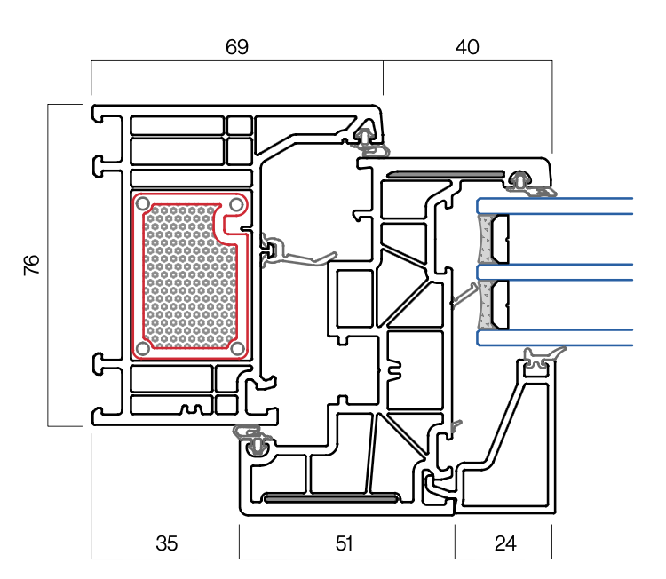 Información Técnica| Sección de marco/hoja | 76 / 85 mm |