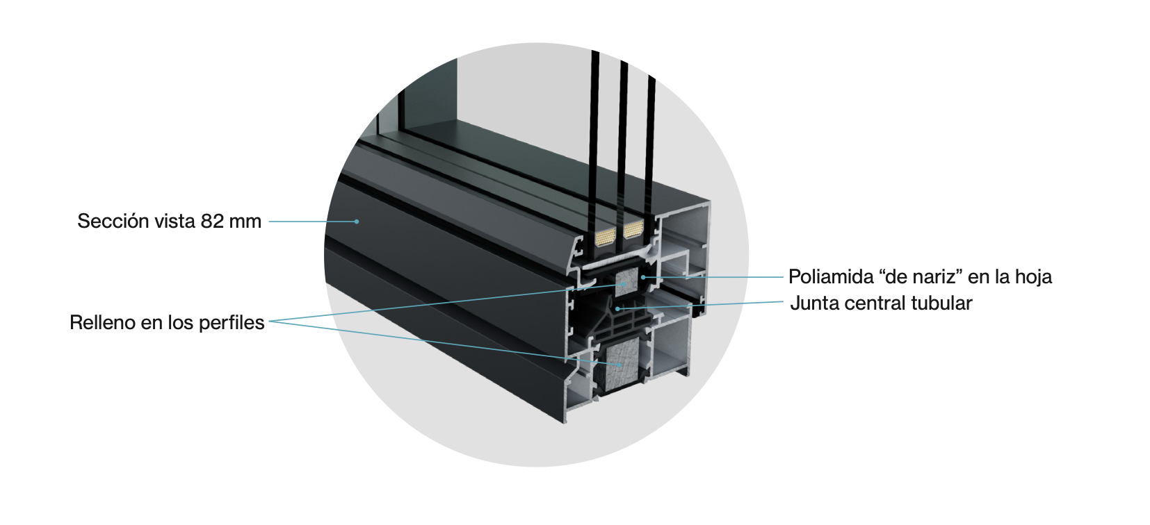 | Sección vista nudo lateral | 82 mm (solo 60 mm de aluminio en vista exterior) |